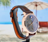 This amazing IWC Portofino Rose Gold Moon Phase, model IW516403 with 45mm 18K rose gold case, beautiful sundust grey dial, 8 day's power reserve hand wounded movement, 18K rose gold buckle on dark brown alligator strap is in a brilliant condition and comes with original box, polishing cloth, booklets, and warranty card from 03-2022 NL and 12 months warranty.