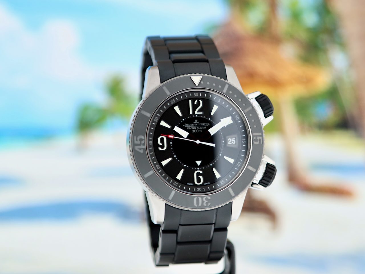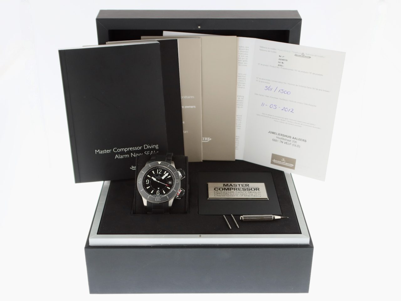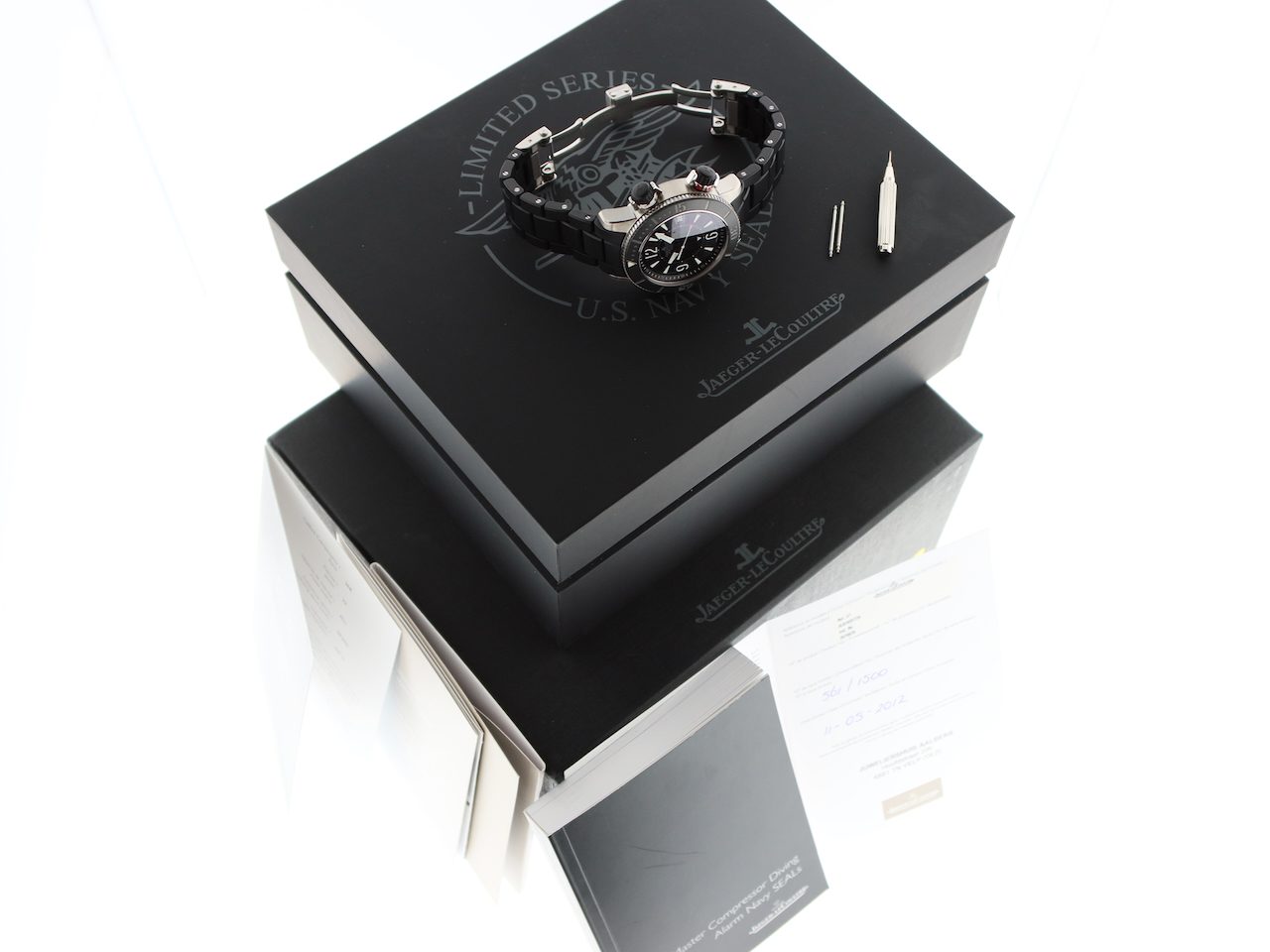 This beautiful Jaeger LeCoultre Master Compressor Navy Seals Alarm Limited Edition in only 1500 pieces (model Q183T770) with 44mm grade 5 titanium stainless steel and titanium case, from watch collector and first owner is in a Brilliant (like new) condition and comes with the rare original Titanium/Rubber bracelet with double folding clasp, original boxes, booklets and warranty paper (05-2012) from authorised dealer in the Netherlands and 12 months warranty.