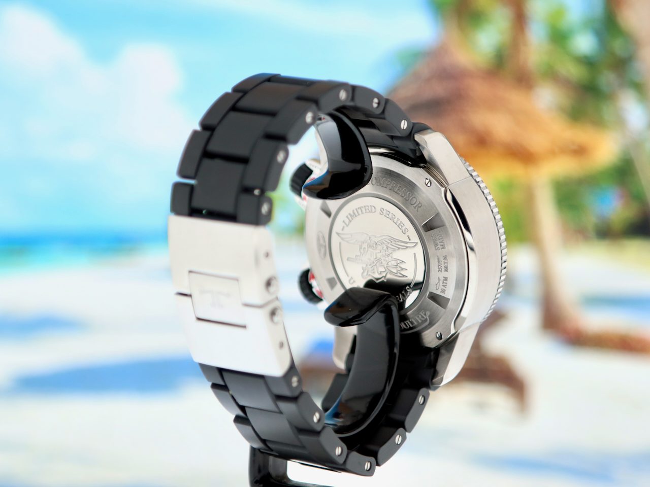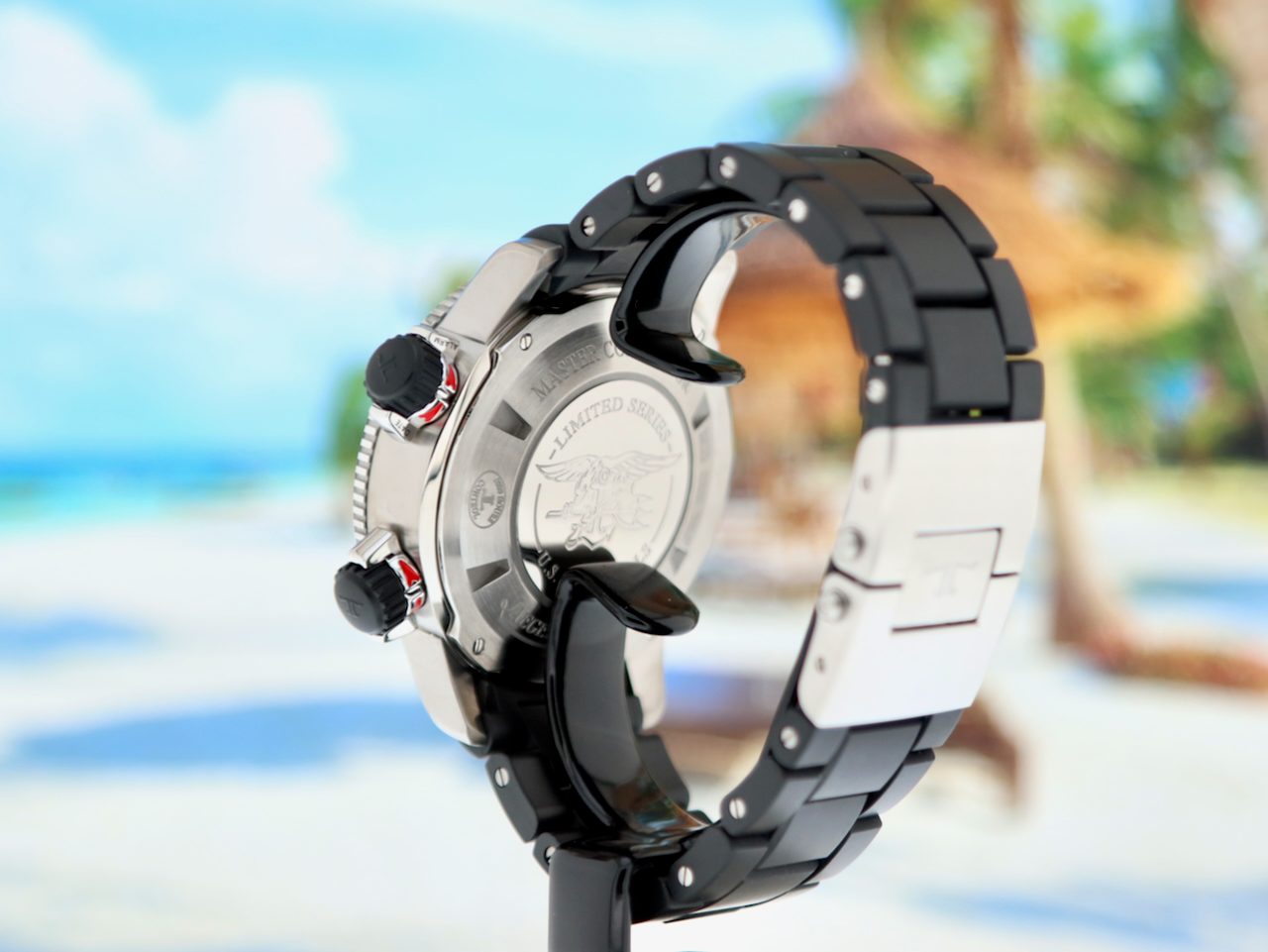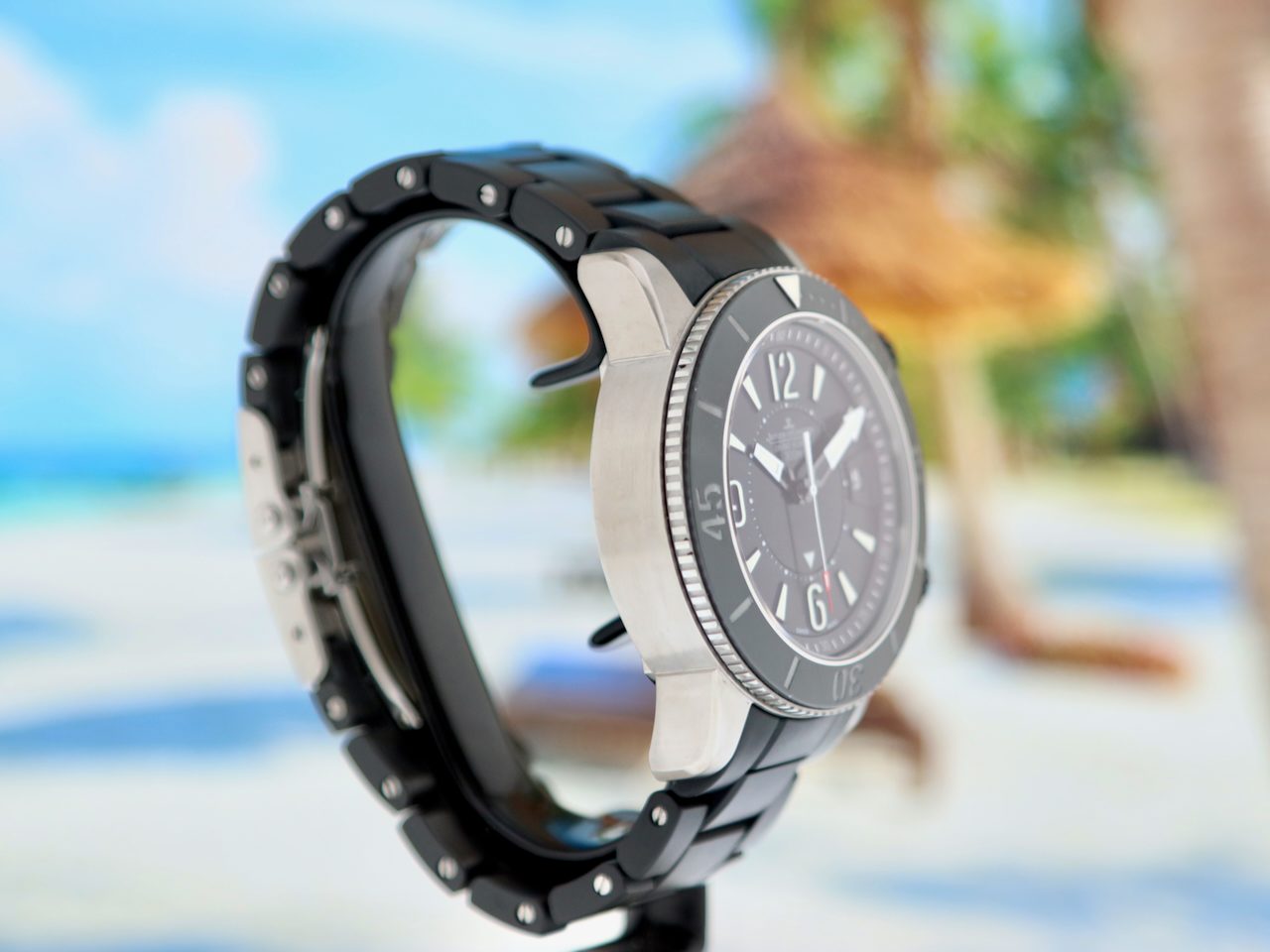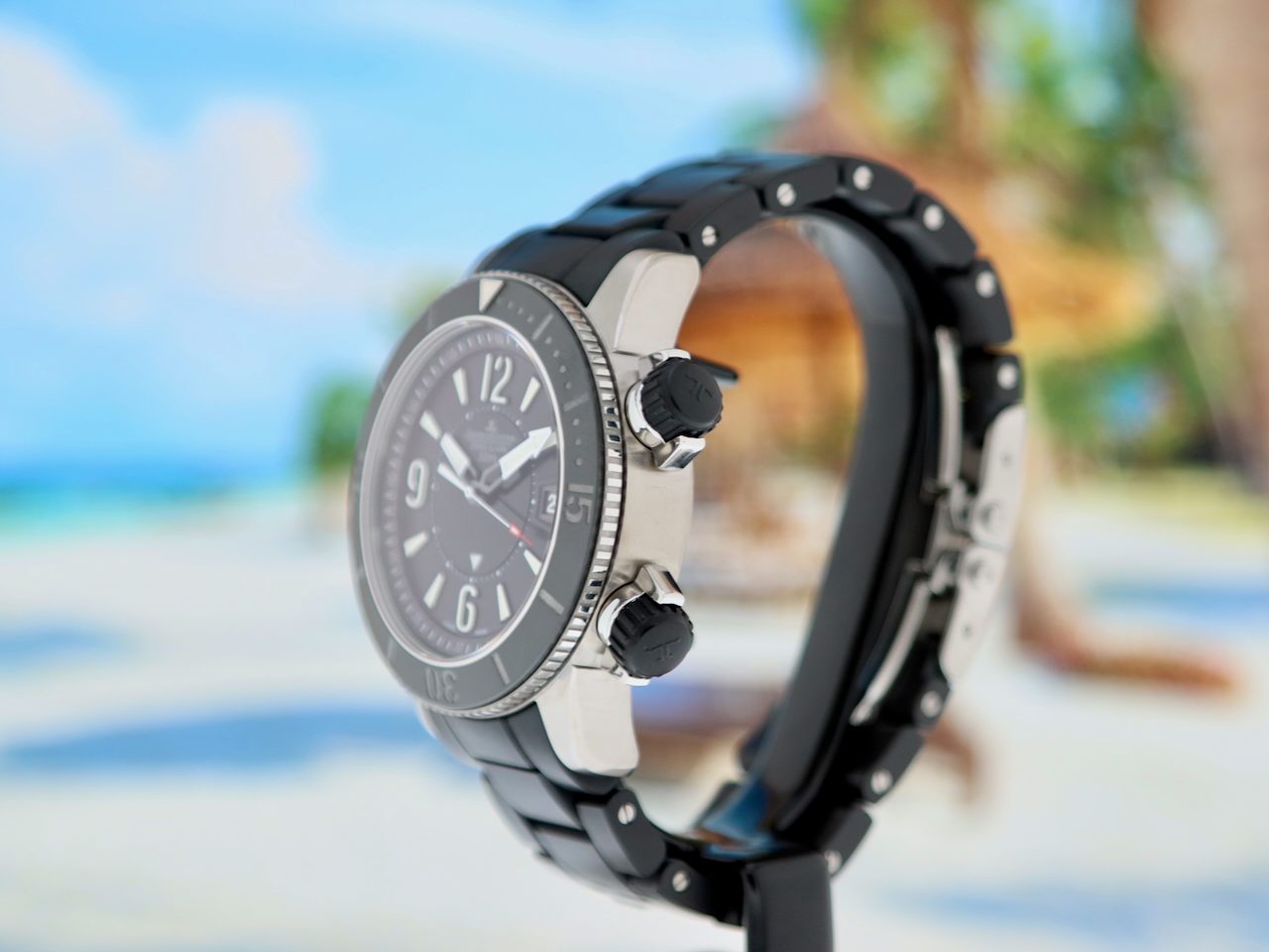 This beautiful Jaeger LeCoultre Master Compressor Navy Seals Alarm Limited Edition in only 1500 pieces (model Q183T770) with 44mm grade 5 titanium stainless steel and titanium case, from watch collector and first owner is in a Brilliant (like new) condition and comes with the rare original Titanium/Rubber bracelet with double folding clasp, original boxes, booklets and warranty paper (05-2012) from authorised dealer in the Netherlands and 12 months warranty.