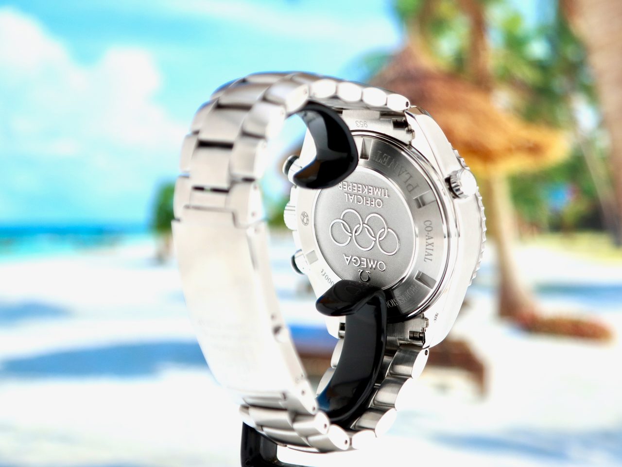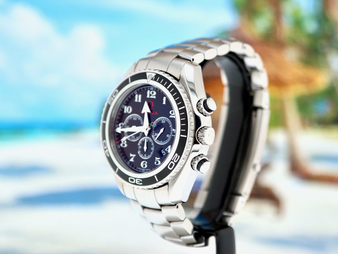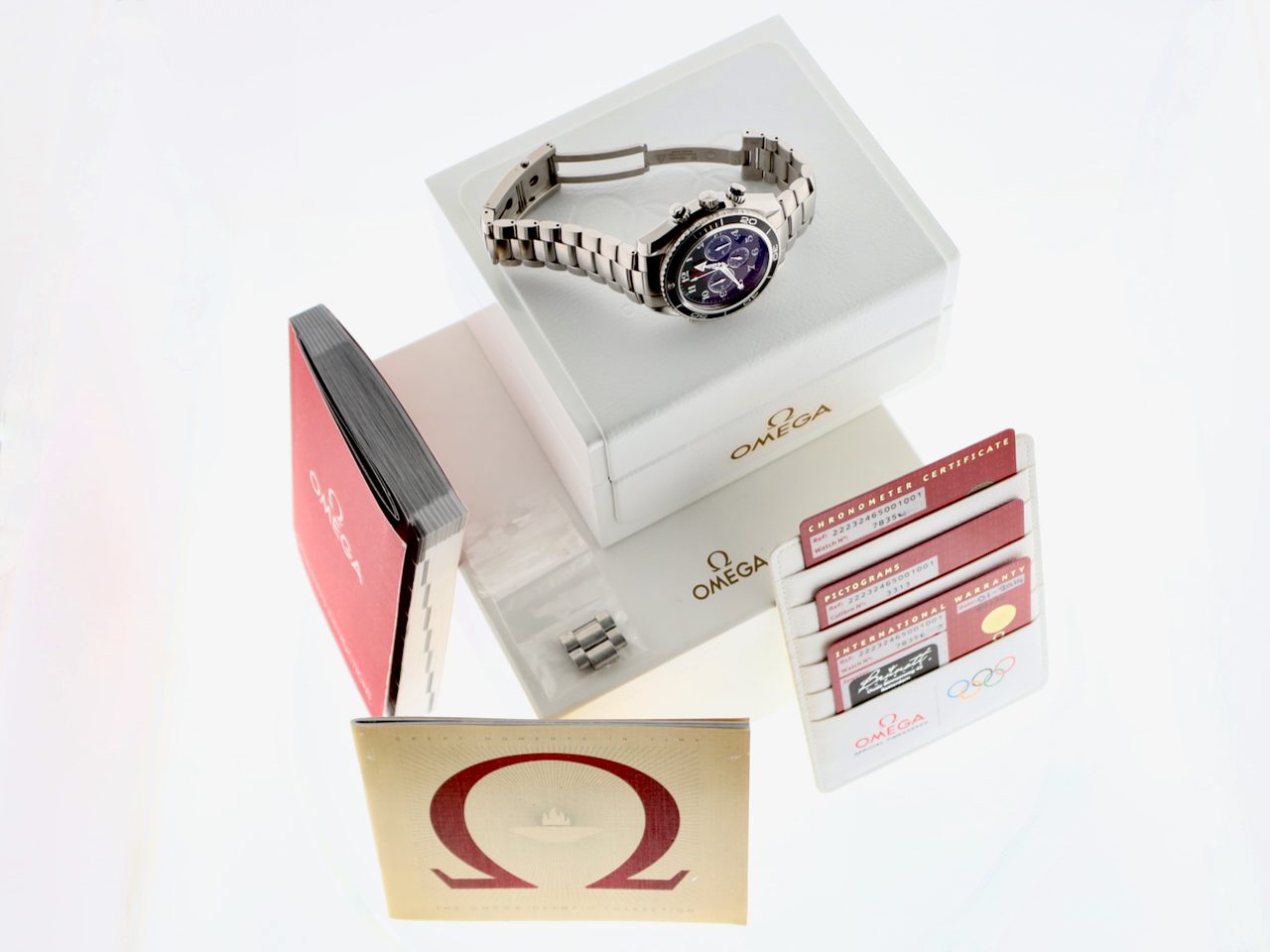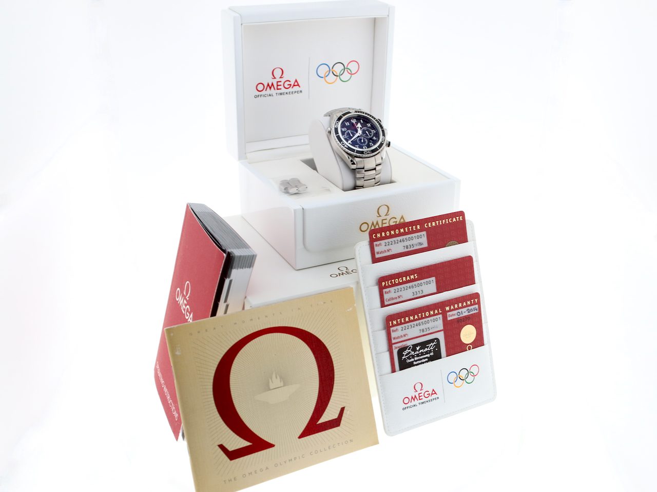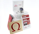 This rare full set Omega Olympic Seamaster Planet Ocean Chronograph 600M (model 22232465001001), a celebration of Omega's role as official timekeeper to the Olympic Games. Its dial has a vintage Omega logo and Arabic numerals. The Olympic rings function as a counterweight to the chronograph seconds hand, original stainless steel bracelet with folding clasp and all the links. The watch is in a brilliant condition and comes with the original boxes, booklets, warranty cards (Netherlands) and 12 months warranty.