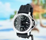 This wonderful full set collectors item Panerai Luminor 44mm GMT Automatic PAM00063 with 44 mm stainless steel case, black rubber strap is in a brilliant condition and comes with the original box set !, booklets and warranty card 10-2000, Panerai service papers from 2014 (NB. after the service in 2014 the watch was kept in banksafe !), screwdriver, bezel protector, two extra straps .