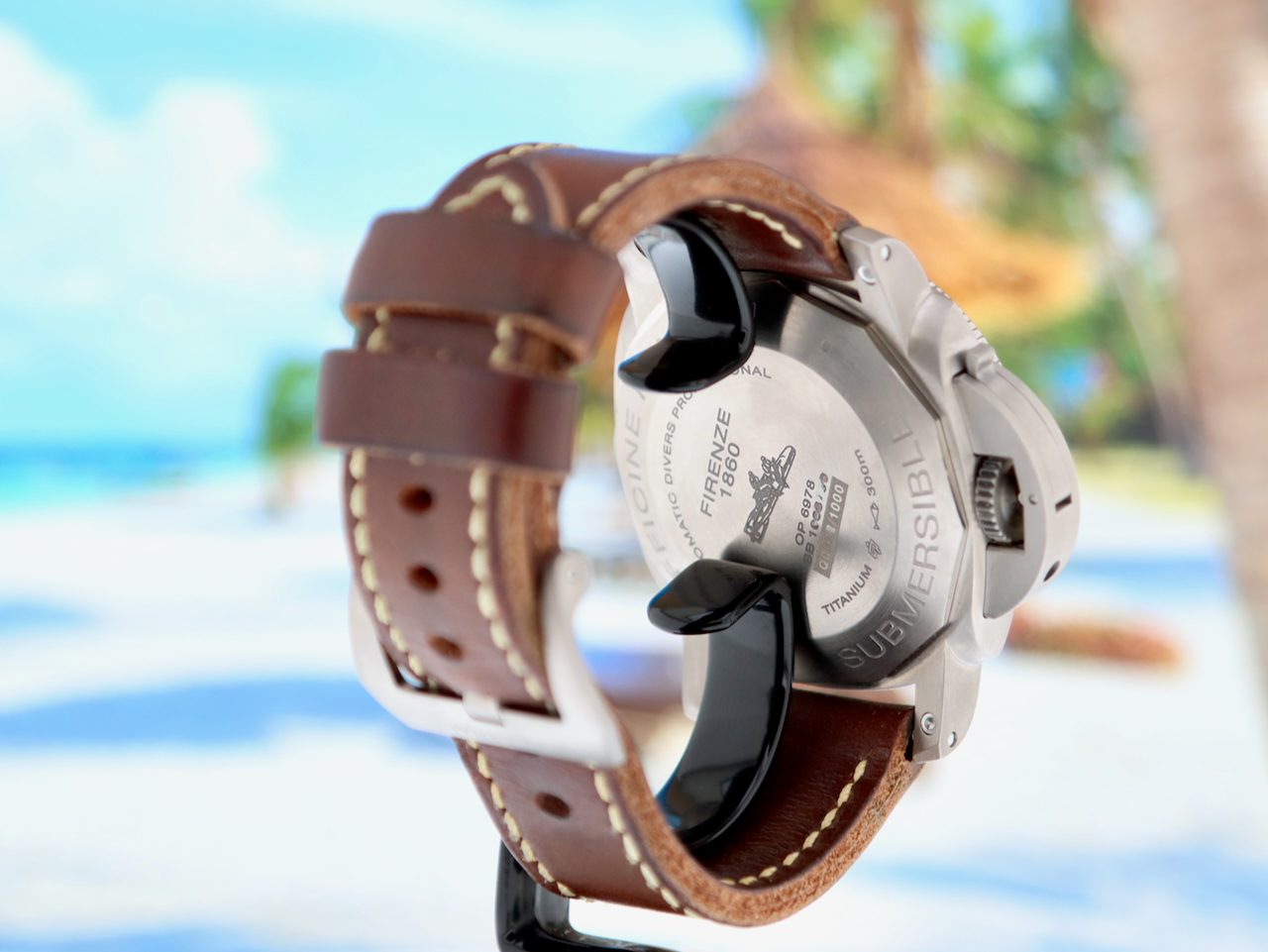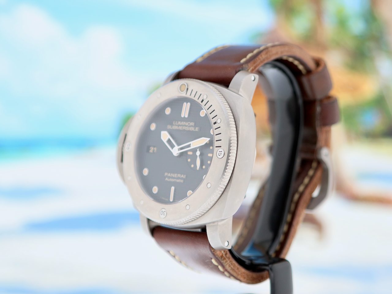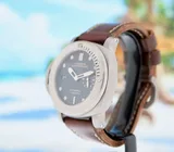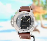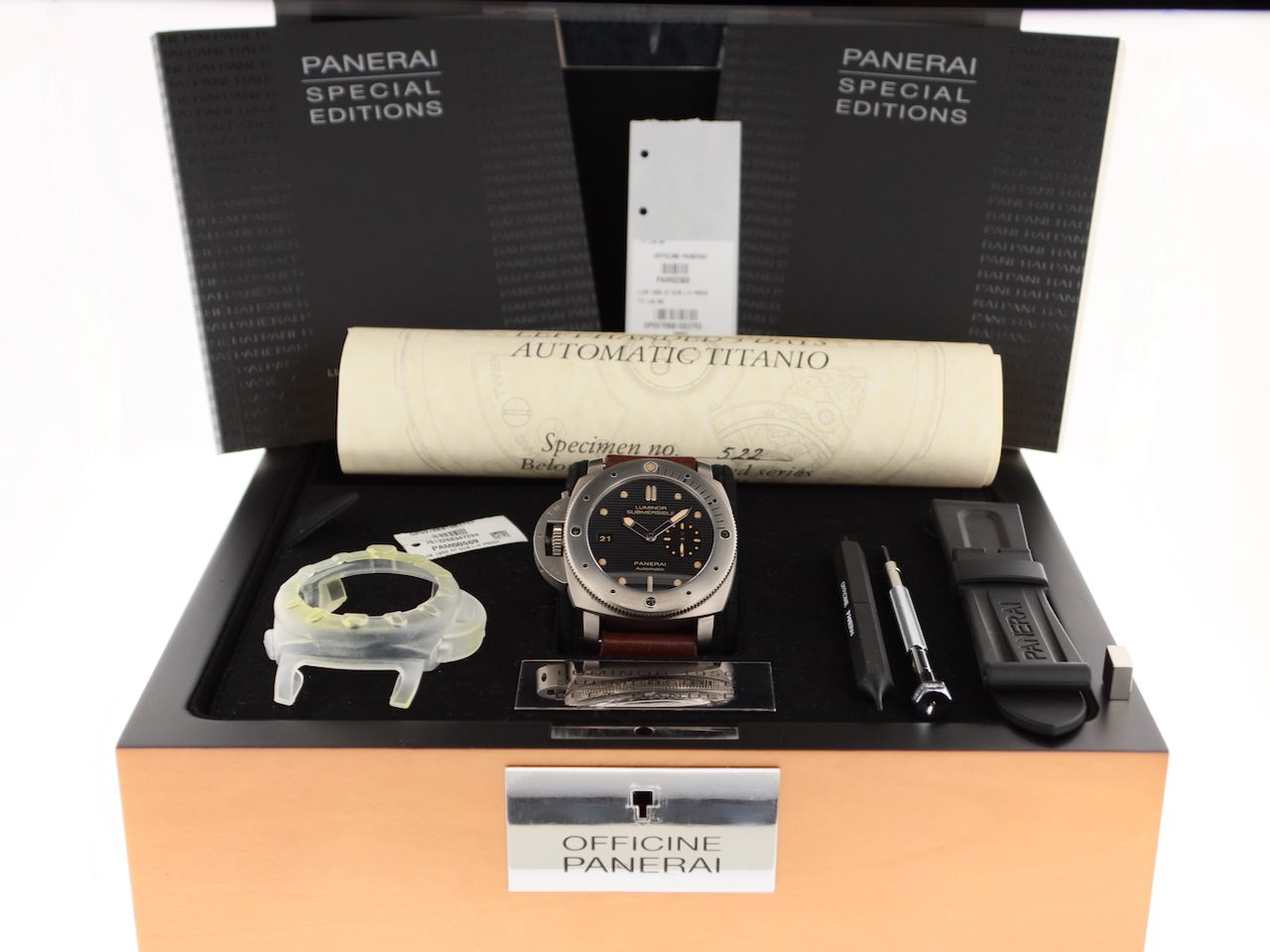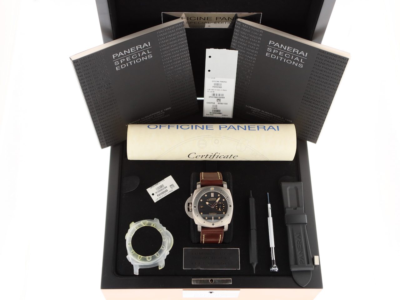 This collectors item Panerai Luminor Submercible Automatic 3 Day's (model PAM000569), Special Edition limited in only 1000 pieces, with 47 mm titanium case, brown leather strap + extra black rubber strap is in a brilliant condition and comes with the original box set, booklets and warranty paper 11-2014 from authorised dealer in the Netherlands, screwdriver, toolkit, polishing cloth, bezel protector and 12 months warranty.