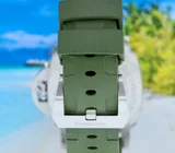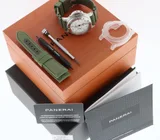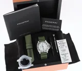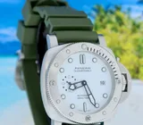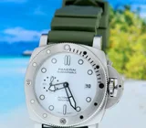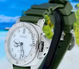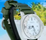 This gorgeous Panerai Submercible Quarantaquattro Bianco (model pam01226) with 44mm brushed steel case, polar white polished dial, 72 hours power reserve automatic movement (P.900) is in a brilliant condition and comes with the original boxes, booklets, warranty paper 08-2022 from authorised dealer in the Netherlands (International Panerai warranty up to 08-2030), toolkit, bezel protector and extra green textile e strap.