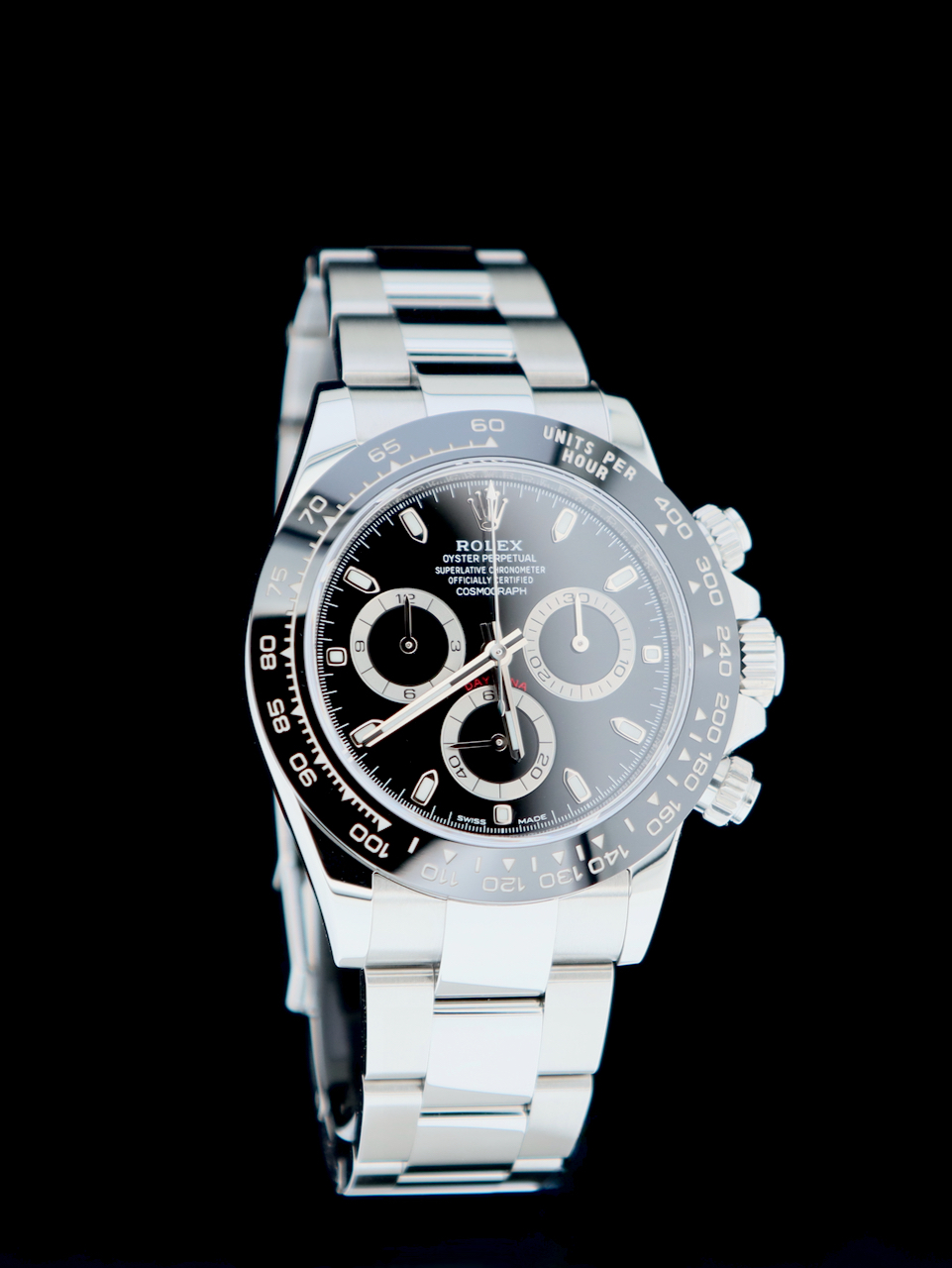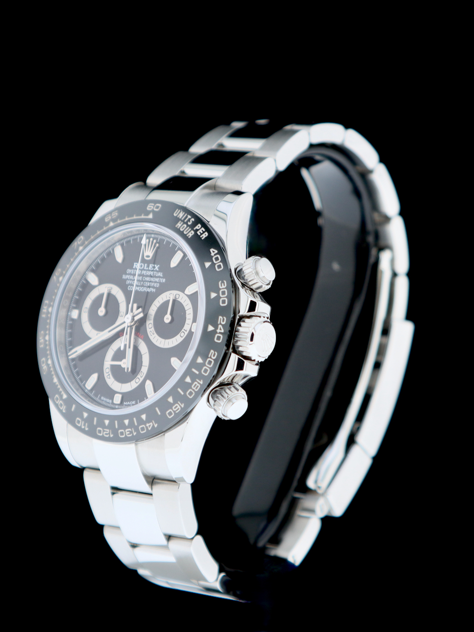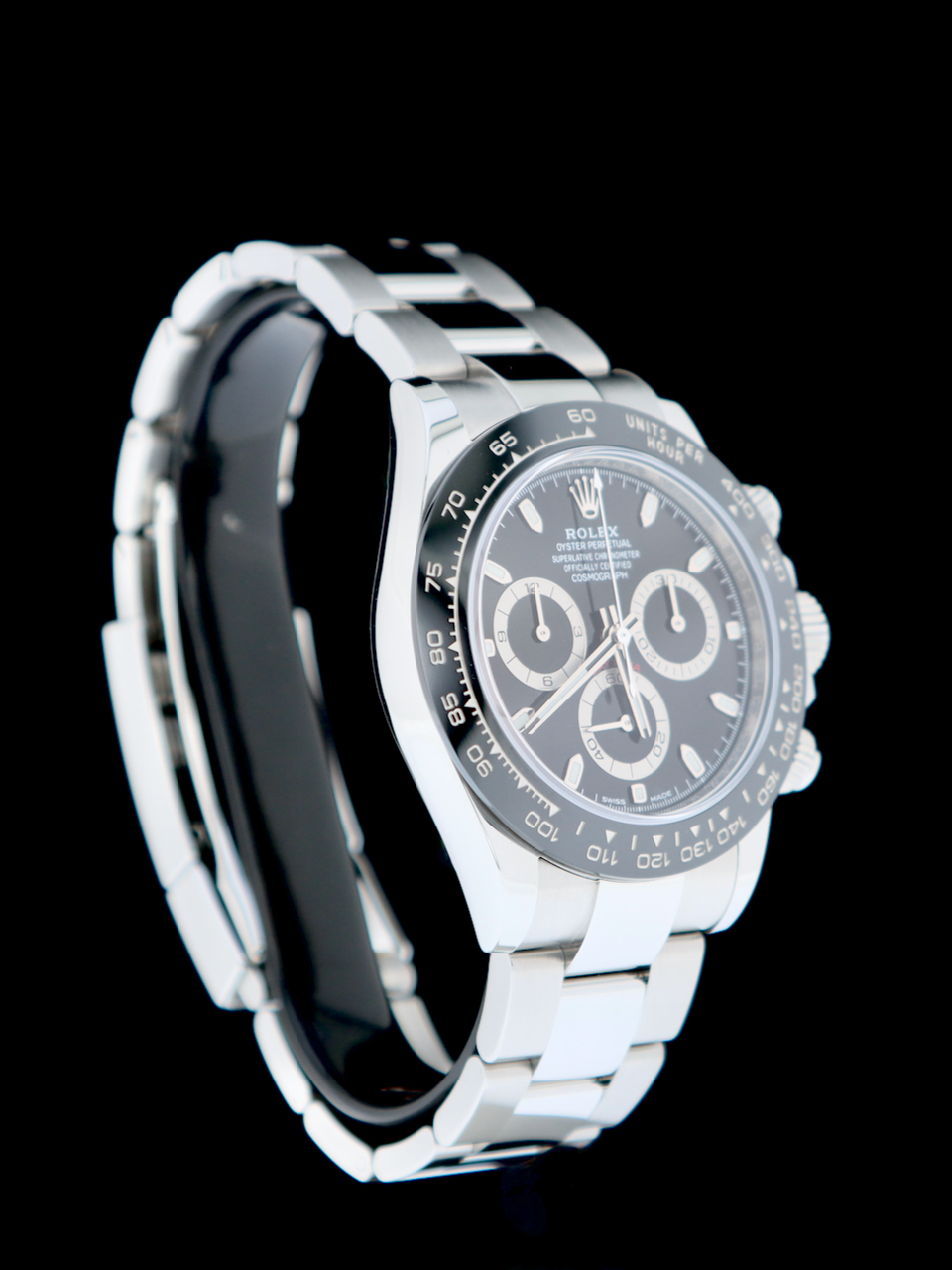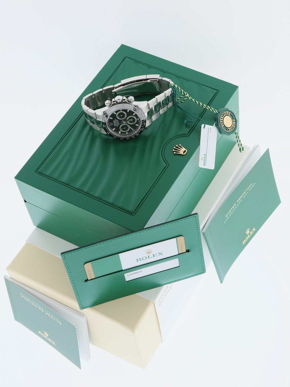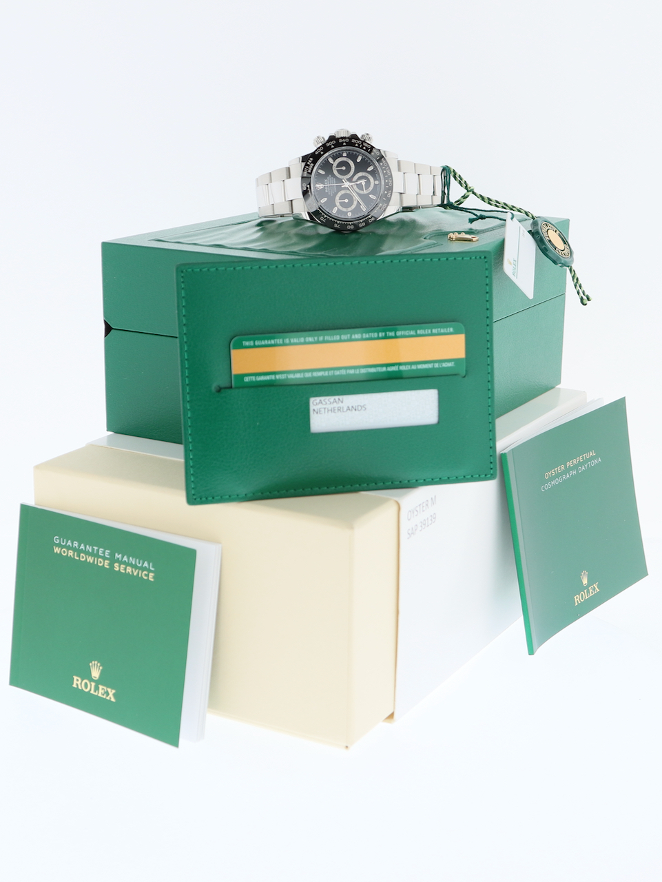 This populair (partly in factory seals) full set Rolex Daytona Chronograph 116500ln with black dial, triple lock waterproofness pushers, is in a unworn condition and comes with original triple box set, booklets, both hang-tags, and warranty card from authorised dealer in the Netherlands 10-2019