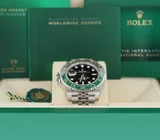 This unworn full set Rolex GMT-Master II (model 126720VTNR) known as "sprite" with 40mm case, jubilee bracelet, black dial, black and green ceramic inlay comes with original triple box set, booklets, hang-tag, bezel protector and warranty card from authorised dealer in 02-2025. (international Rolex warranty until 02-2030!).