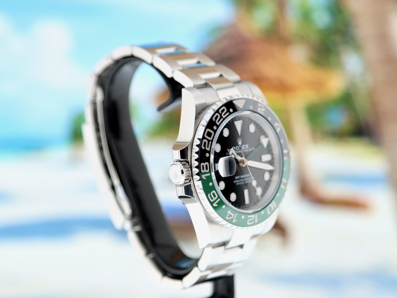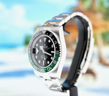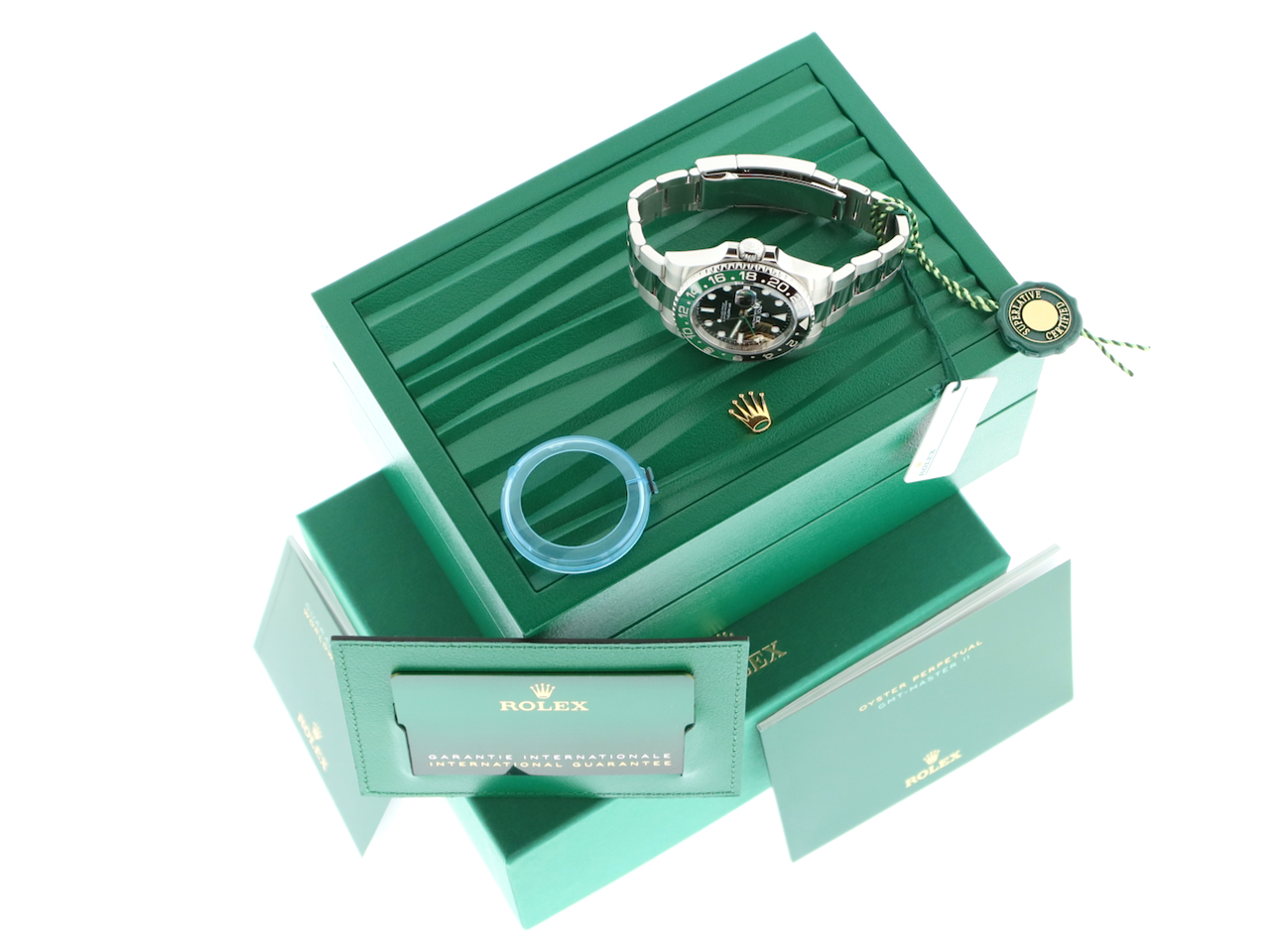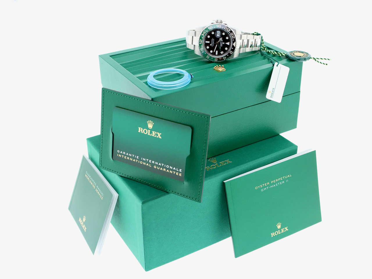 This full set unworn (partially in the factory seals) Rolex GMT-Master II (model 126720VTNR) known as "sprite" with 40mm case, Oyster bracelet, black dial, black and green ceramic inlay comes with original new Rolex model boxes, booklets, both hang-tags with matching numbers!, bezel protector and warranty card from authorised dealer in the Netherlands 07-2025. (international Rolex warranty until 07-2030!).