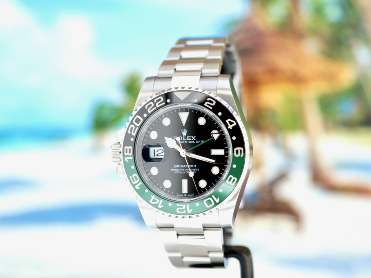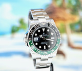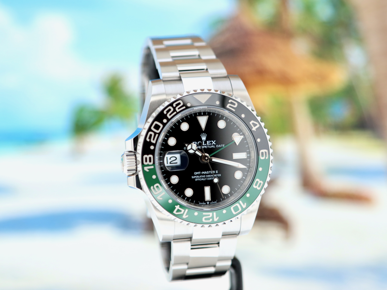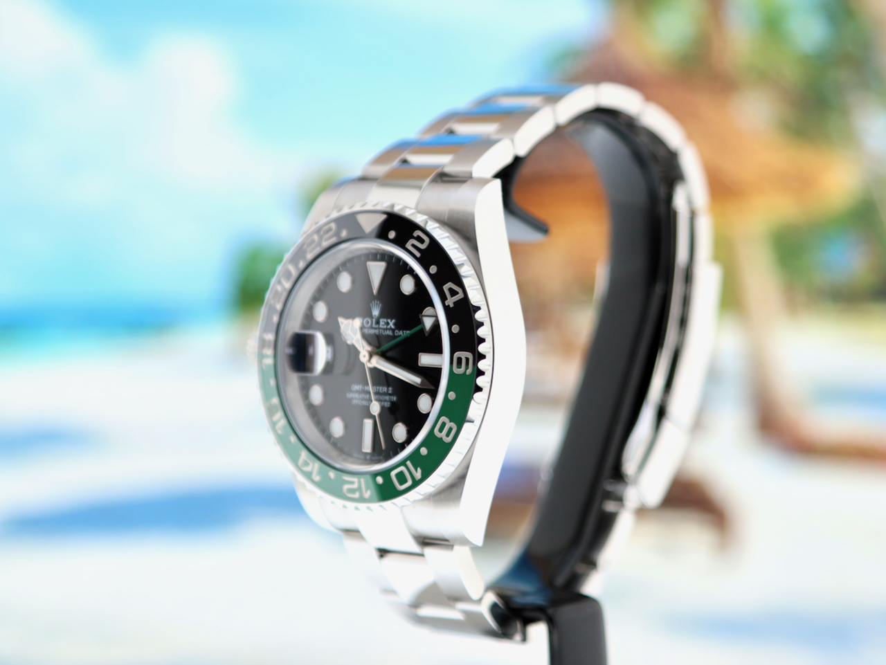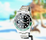 This full set unworn (partially in the factory seals) Rolex GMT-Master II (model 126720VTNR) known as "sprite" with 40mm case, Oyster bracelet, black dial, black and green ceramic inlay comes with original new Rolex model boxes, booklets, both hang-tags with matching numbers!, bezel protector and warranty card from authorised dealer in the Netherlands 07-2025. (international Rolex warranty until 07-2030!).