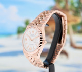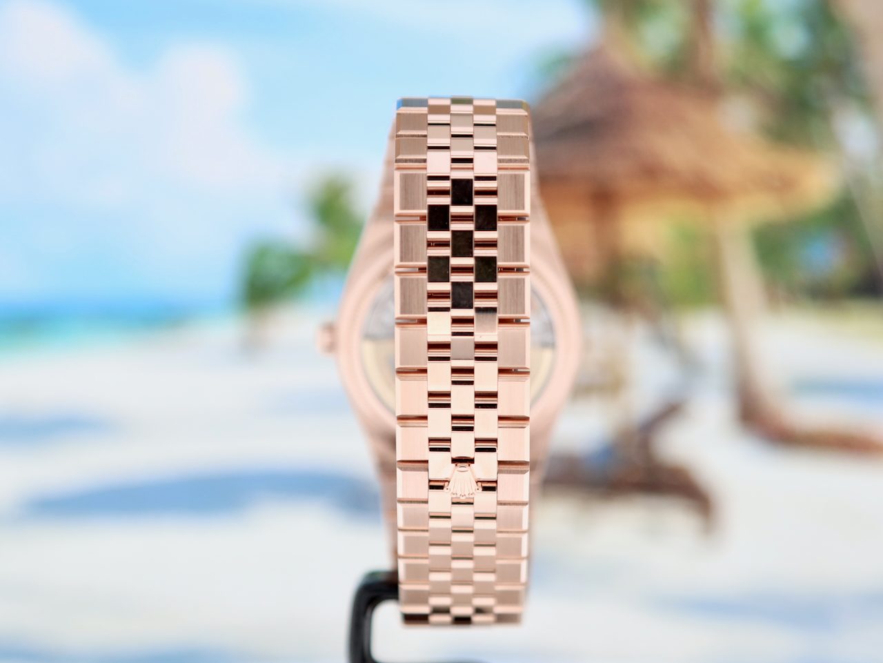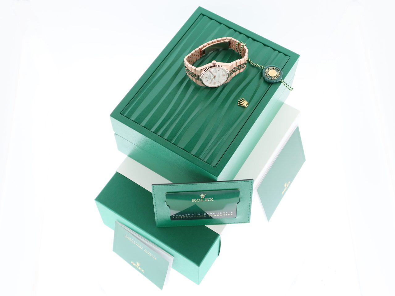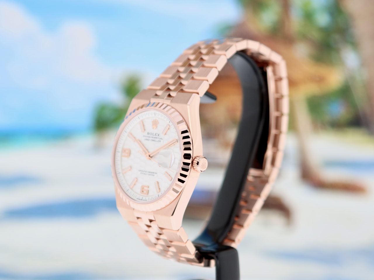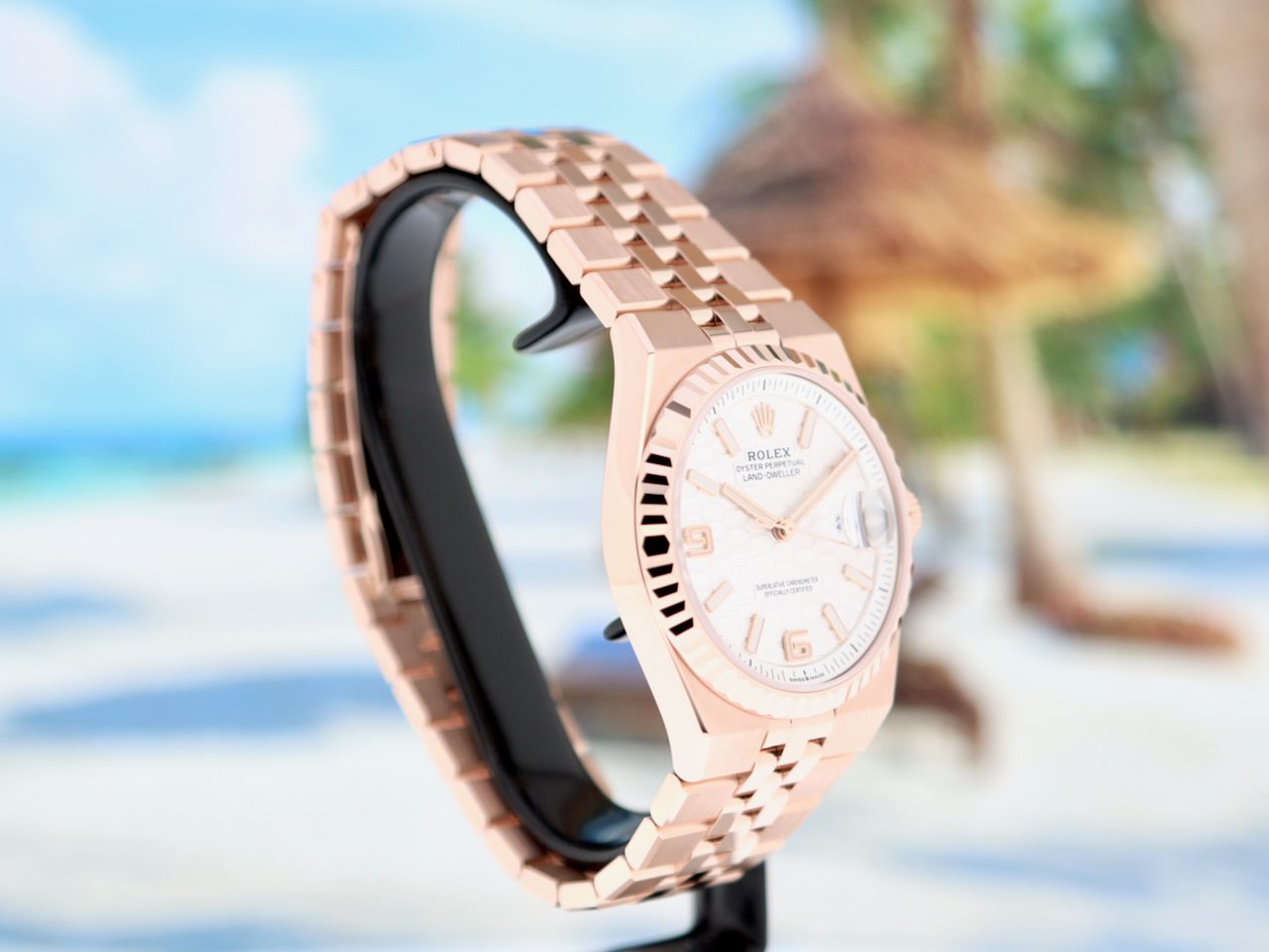 This unworn beautiful newest Rolex model the Land-Dweller (127335) with 36mm 18 ct Everose-gold case, flat jubilee 18 ct Everose-gold bracelet, refined laser engraved white honeycomb black dial, comes with original new model Rolex boxes, booklets, hang-tag and warranty card from authorised dealer 12-2025. (international Rolex warranty until 12-2030!).