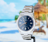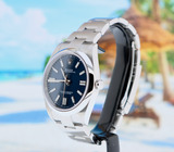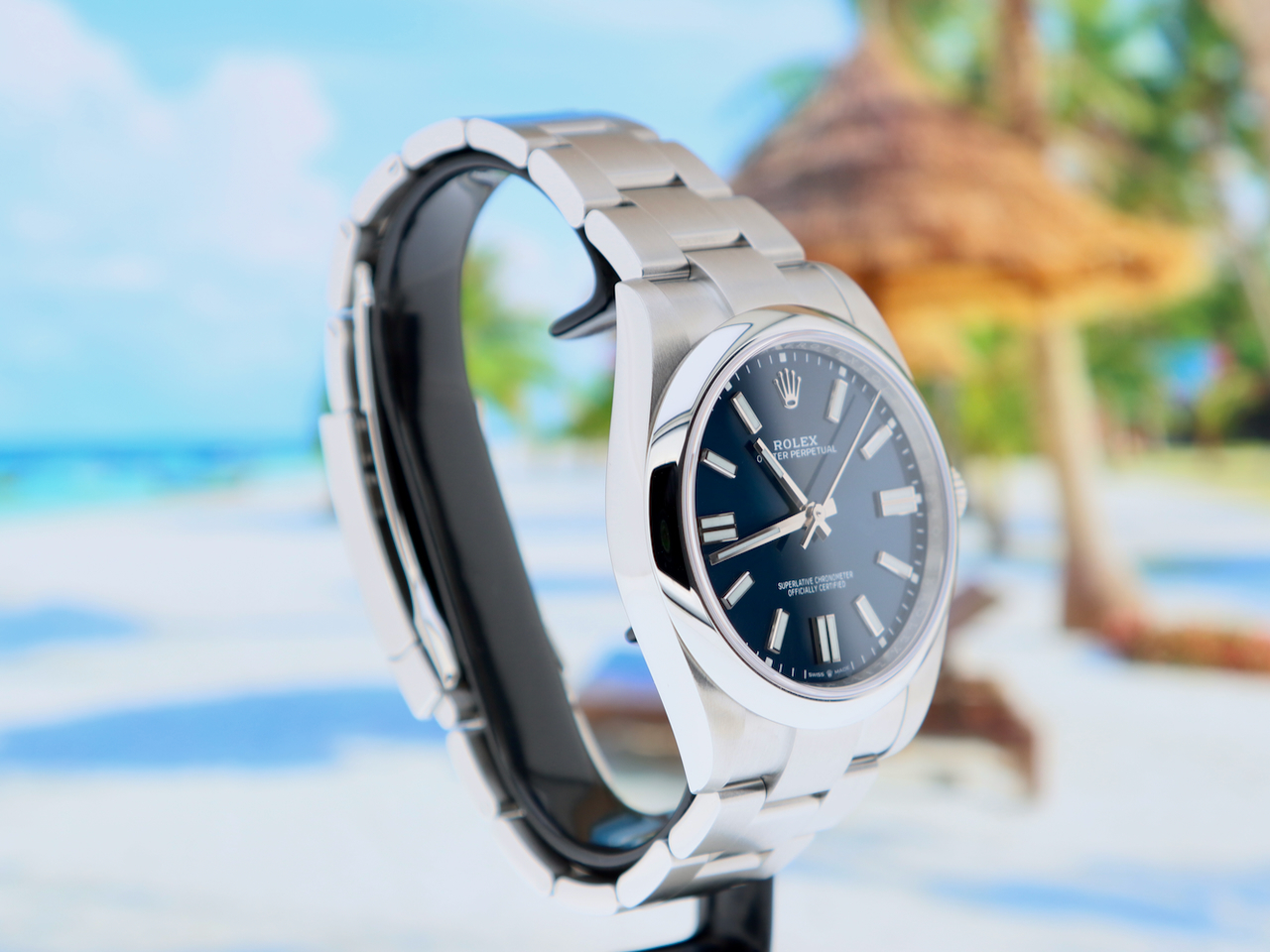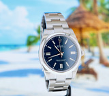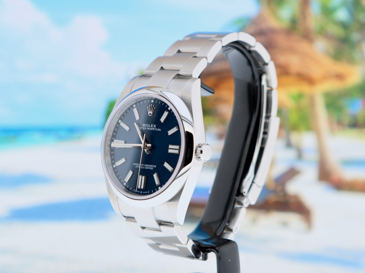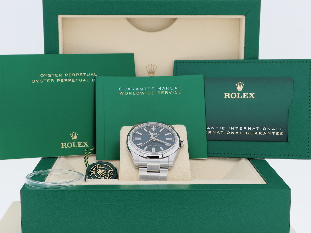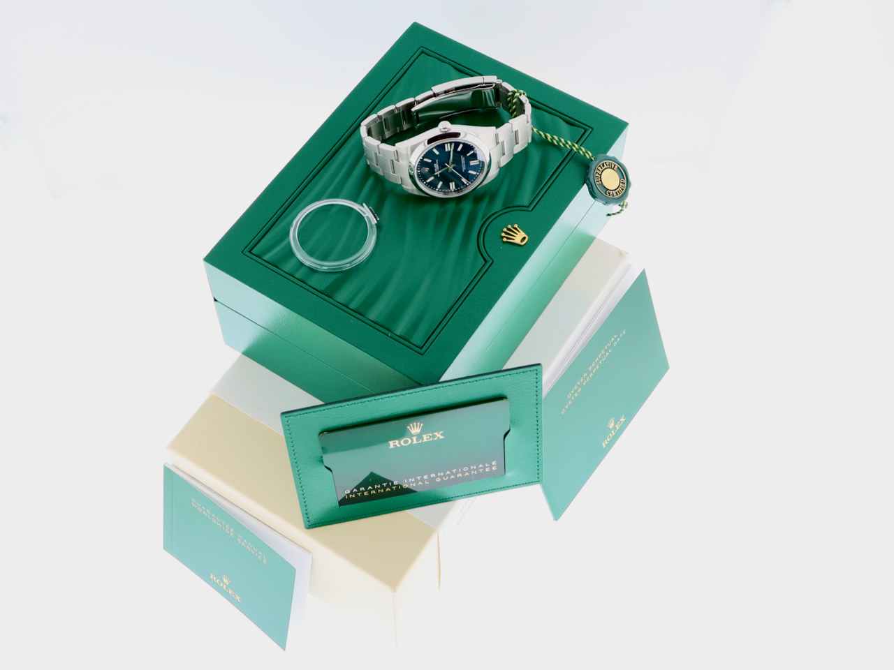 This Unworn full set Rolex Oyster Perpetual with 41mm steel case (model 124300), smooth bezel, oyster bracelet and beautiful blue dial comes with original triple box set, booklets, hang-tag and warranty card (02-2024) delivered by an authorised dealer in the Netherlands (international Rolex warranty until 02-2029)